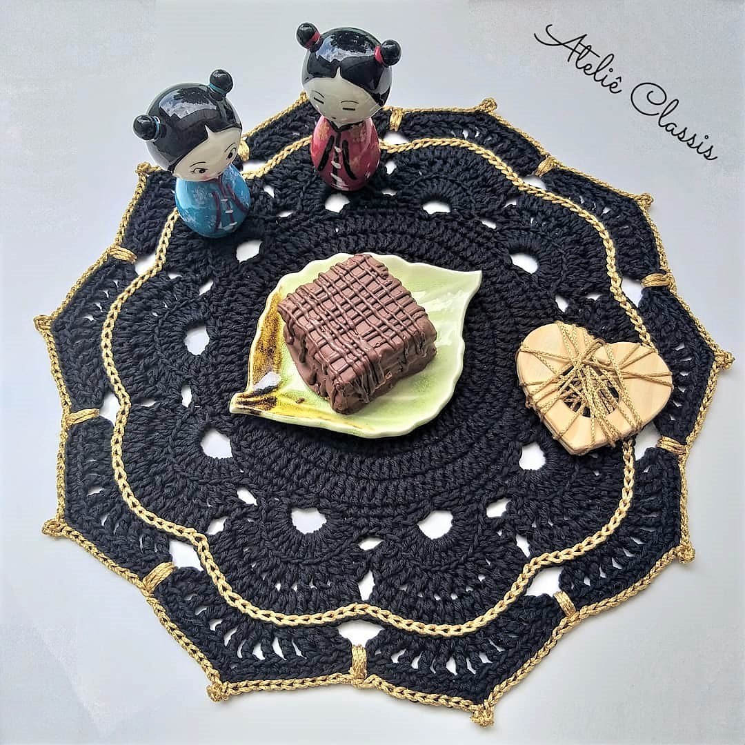 Feita na cor preta, a peça esbanja sofisticação. Os detalhes, em fio ouro, acrescentam beleza à mesa de refeição.